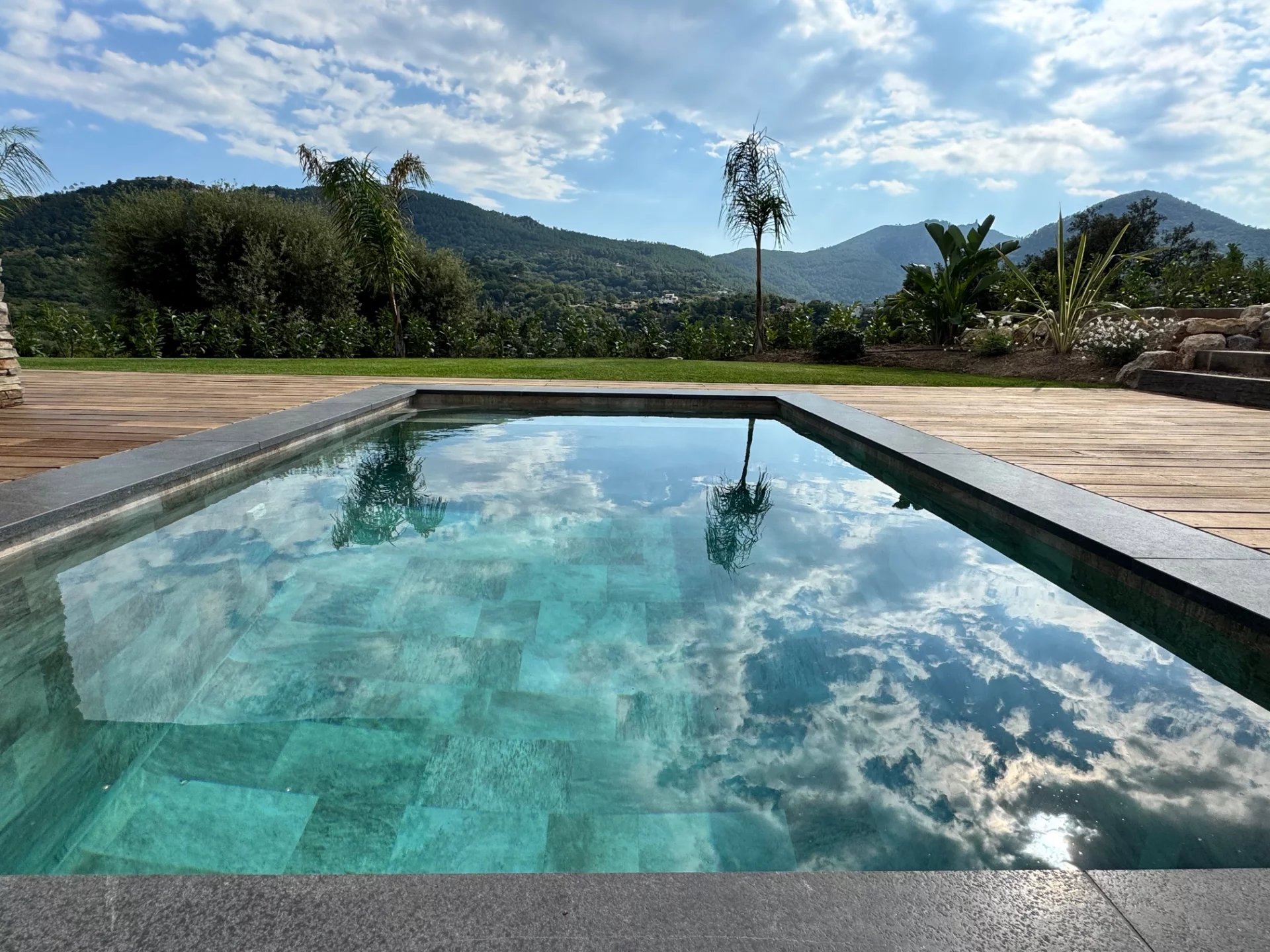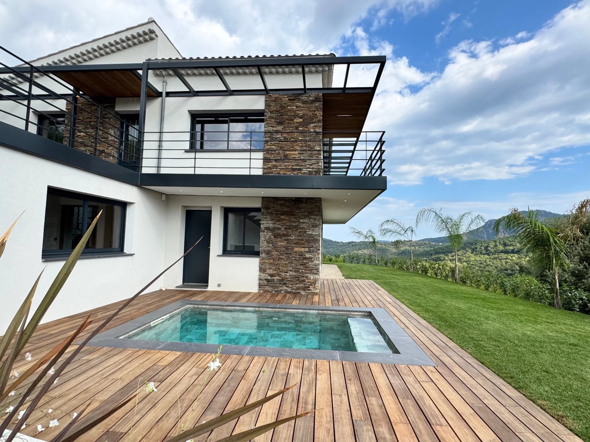 À l’extérieur, un bassin de style balinais agrémente un terrain partiellement paysager de 1600 m² env., offrant un cadre de vie privilégié.